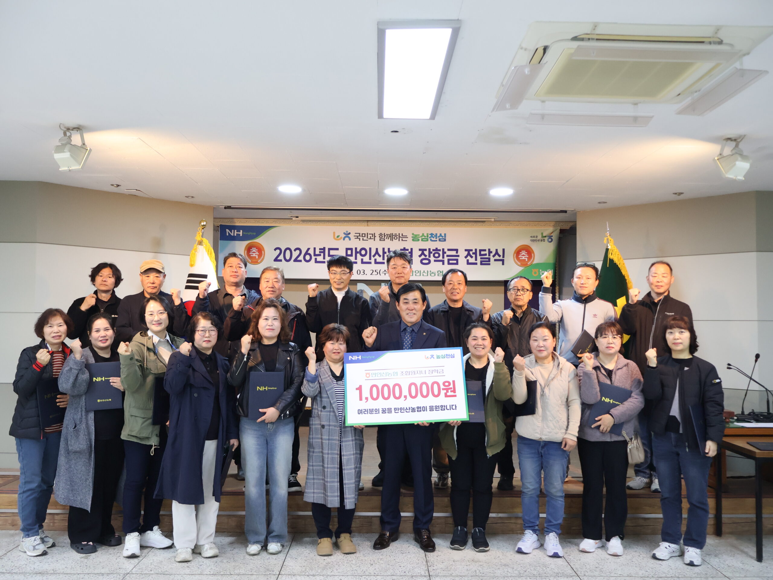 이날 만인산농협은 조합원의 교육비 부담 경감과 지역 인재 육성을 위해 조합원 자녀 대학생 23명에게 1인당 100만 원씩, 총 2300만 원의 장학금을 지원하며 지역사회에 따뜻한 나눔을 실천했다.